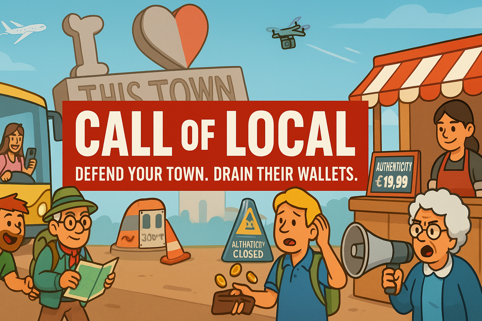 Call of Local is a satirical tower defense where you protect your town’s landmark from endless waves of tourists. Build food stalls, overpriced hotels, ticket booths, and protests to drain their wallets and morale before they overrun the city. From drunk Brits and bachelorette parties to influencers and Karens, every tourist has a weakness — and it’s up to you to exploit it.